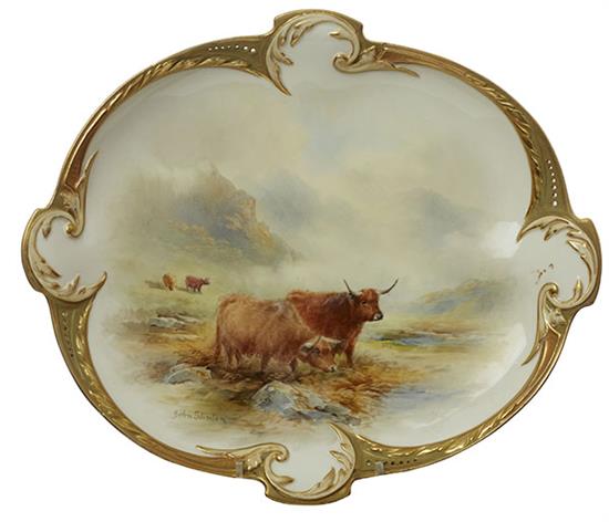A ROYAL WORCESTER 'HIGHLAND CATTLE' PORCELAIN DISH BY JOHN STINTON, DATED 1912
