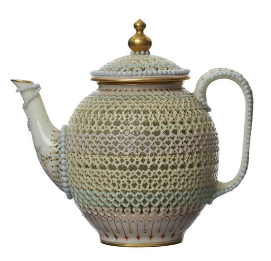 A FINE ROYAL WORCESTER JEWELLED 'GEORGE OWEN' RETICULATED PORCELAIN TEAPOT AND COVER, DATED 1876