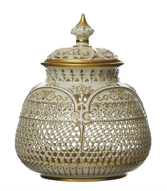 A ROYAL WORCESTER JEWELLED GEORGE OWEN RETICULATED PORCELAIN VASE AND COVER, DATED 1914