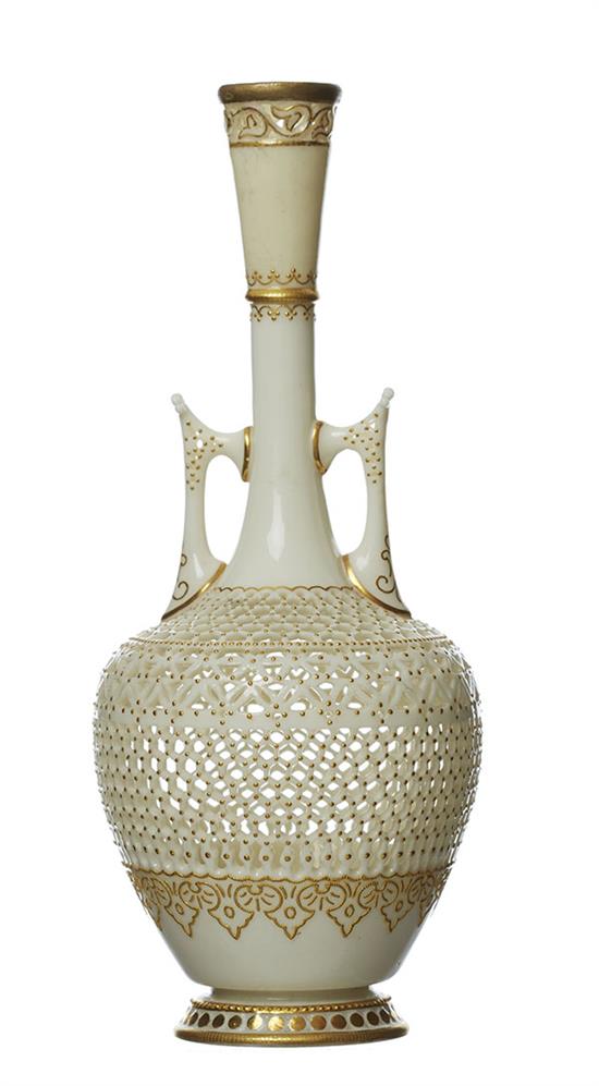 A ROYAL WORCESTER JEWELLED GEORGE OWEN RETICULATED PORCELAIN VASE, DATED 1912