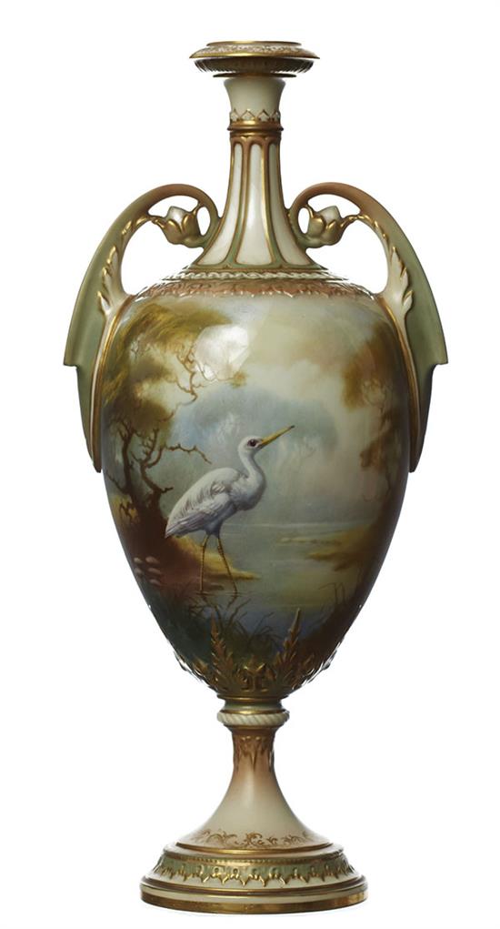 Of baluster twin handled form with bud and acanthus capped handles, raised from circular stepped foot, the body painted with cranes in a marsh landscape, marks in green, shape 248B, 29.5cm high.