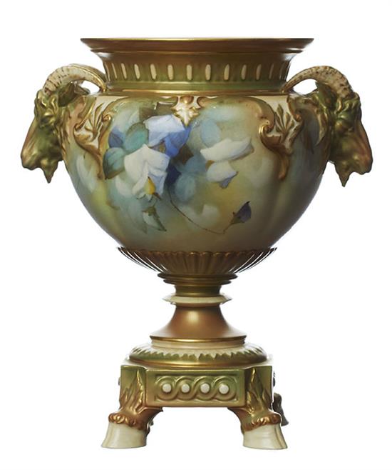 With rams head moulded handles, raised from four hoof feet and stepped base the gently lobed body painted with sweet peas, marks in green, shape 250, incised E.W, 19cm high.