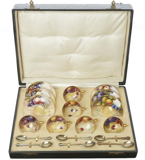 A ROYAL WORCESTER BOXED 'FRUIT' PAINTED COFFEE SET, SIGNED AUSTIN, PRICE, HARPER AND FLEXTMAN