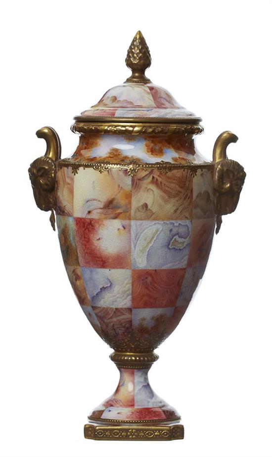 With gilded acorn finial and rams mask handles, painted to an exhibition standard with simulated agate specimen panels framed with gilded and moulded borders, 26.5cm high.