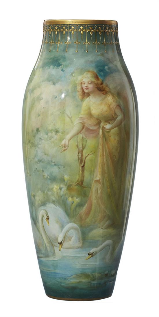 Of tapered form with gilded rim and tooled gilt neck, profusely painted with swans in a lake being fed by a fair maiden in a long gown, 29.5cm high.