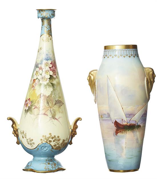 One with Pharaoh mask handles and painted with ships on the Nile, the other with flowers, 27.5cm and 22cm high, (2).