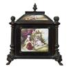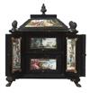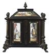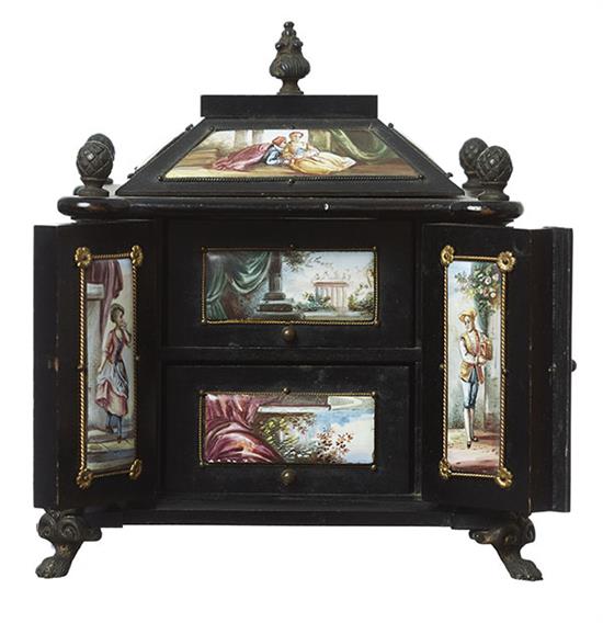 Embellished with painted enamel plaques of court dignitaries' in various pose, the domed cover with acorn finials, the rounded corners supported by bronze columns on four lion paw feet, fitted with two drawers and enamel plaques, 14cm width x 10cm depth x 15.5cm high.