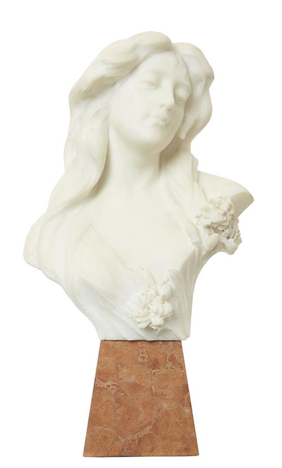 Carved in the Art Nouveau aesthetic with long flowing hair and flower on marble stand, signed Prof G.Vinani Galleria Bazzanti Florence, 56cm high