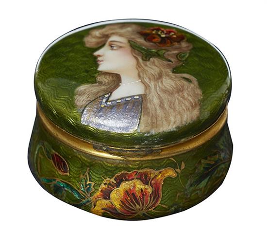 The cover painted with portrait of a lady with long flowing hair and jewelled in enamel, the sides with stylised flowers. 5cm diameter.