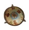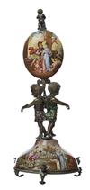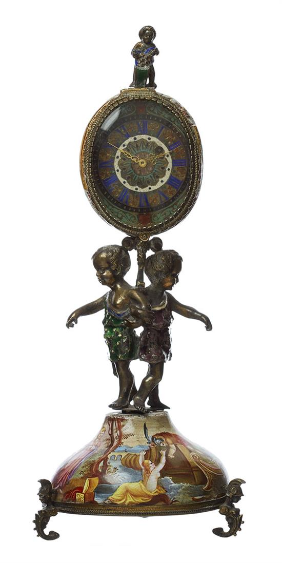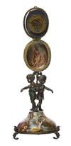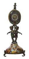 The cloisonné face supported in enamelled egg, opening to reveal movement and painted interior with classical figure, surmounted by putto finial and supported by two putti on enamel domed base profusely painted with classical allegorical figures and a landscape to the base, on three feet, 20cm high.