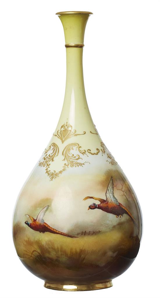 Of bottle form, with tolled gilded shoulder, painted with pheasant in flight over a field, green mark, shape F105, 20.5cm high.