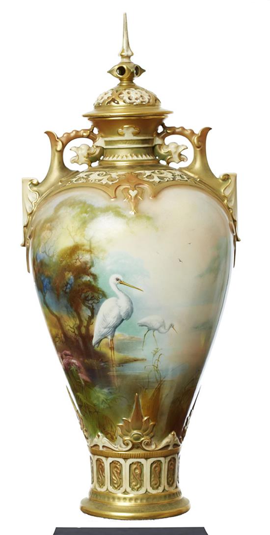 A ROYAL WORCESTER 'CRANE' PORCELAIN VASE AND COVER BY WALTER POWELL, DATED 1908