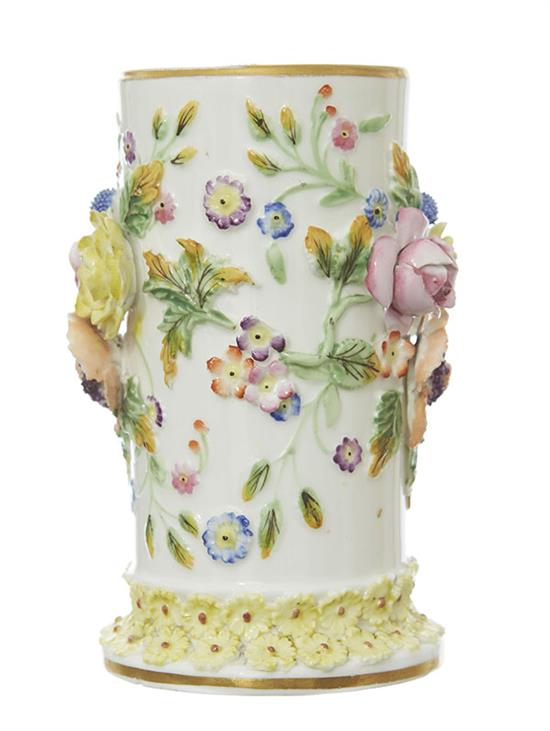 Encrusted with floral and foliate sprays with band of applied flowers to circular spread foot, gilded rim, 10.5cm high.