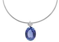 The oval cut tanzanite of 52.00cts, having a surmount of three marquise cut diamonds totalling 1.10cts, to an omega chain, all mounted in 18ct white gold, accompanied by a GIA identification certificate.
