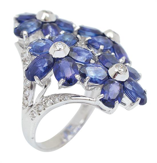 Comprising four flowers set with oval cut sapphire petals and a round brilliant cut diamond to the centre, mounted in 18ct white gold, ring size M.