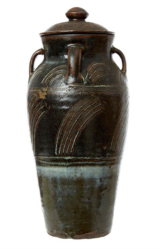Wheel turned pot with loop handles on the shoulder, wax relief design on a blue brown glaze, 40cm high.