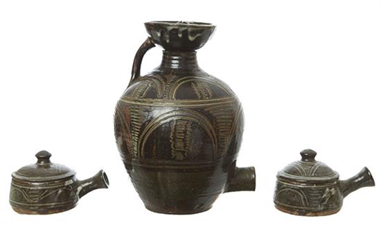 AN ABUJA WAX RELIEF POTTERY WATER JUGAND COVER, WITH PAIR OF DISHES AND COVERS BY HASSAN LAPAI, CIRCA 1970