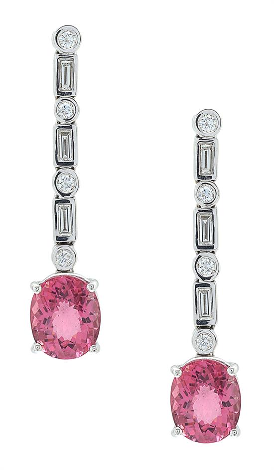 Each earring set with an oval cut rubellite of 3.01cts, surmounted by a row of alternating round brilliant and baguette cut diamonds totalling 0.56cts, mounted in 18ct white gold.