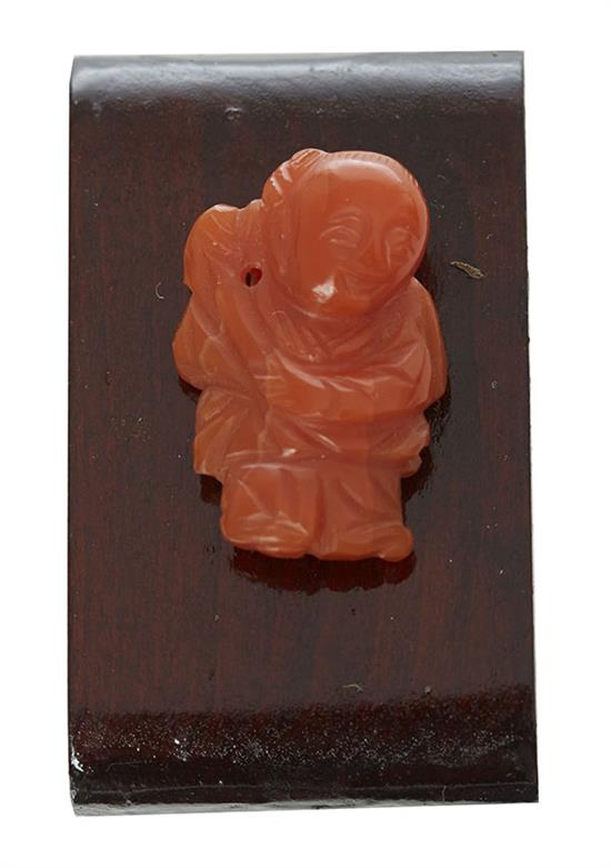 A carving of a smiling boy holding a lotus flower, 2cm.