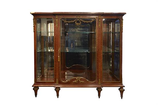 The fitted marble top above three bevelled glass doors enclosing two glass shelves and mirrored back, supported on six ormolu mounted feet, 140cm width x 45cm depth x 140cm high.