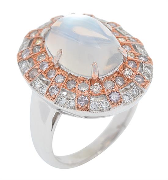 A RAINBOW MOONSTONE AND DIAMOND RING