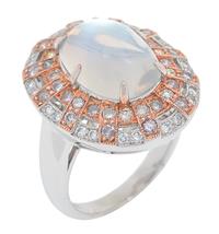 The oval moonstone cut en cabochon, surrounded by thirty six pale pink and twenty four white round brilliant cut diamonds, mounted in 18ct white gold, ring size K.