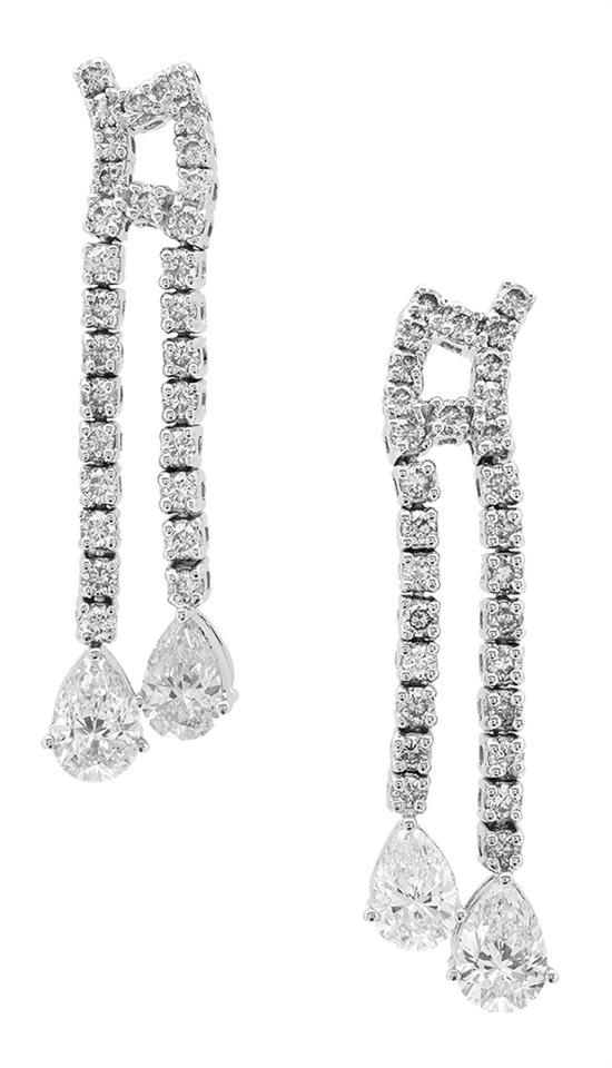 Each double drop featuring two pear cut diamonds of 1.84cts total, surmounted by two single rows of round brilliant cut diamonds totalling 0.62cts, mounted in 18ct white gold, total length 45mm.