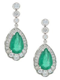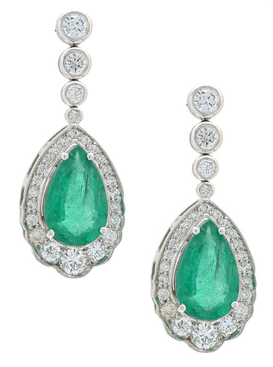 Each set with a pear cut emerald of 4.23cts, surrounded by round brilliant cut diamonds and surmounted by four graduated diamonds, mounted in 18ct white gold.