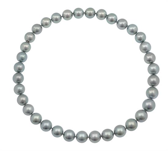 The graduated round pearls of grey green hues measuring 12.20mm - 15.50mm, individually knotted to a concealed clasp, total length 470mm.