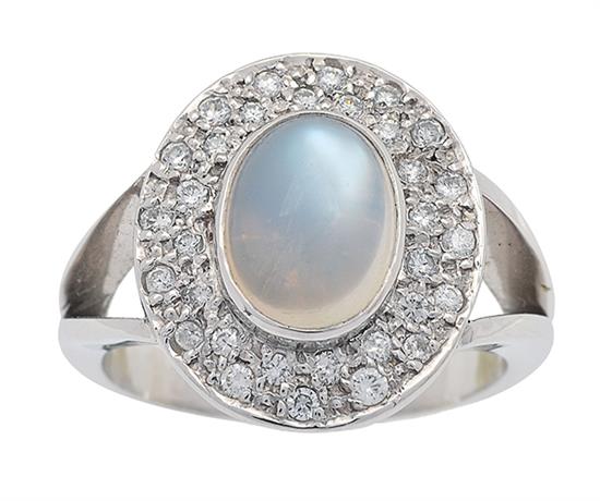 The oval moonstone cut en cabochon, surrounded by round brilliant cut diamonds totalling 0.40cts, mounted in 18ct white gold, ring size L.
