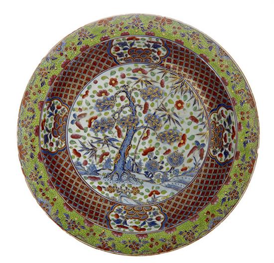 Central tree motif, lattice and floral border with gilt highlights, 36cm diameter.