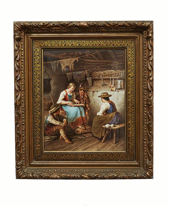 Finely painted scene of a traditional German rural family, the two children gather around their mother playing a zither, signed Thallmaier Munchen, 25cm x 32cm, within mount.
