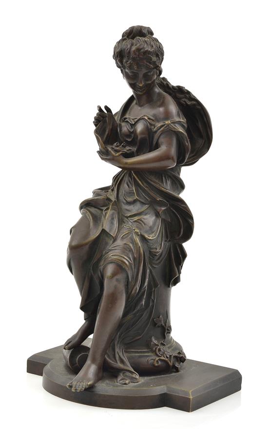 modelled as classical seated female with a nest of birds in hand , E.B foundry mark to base, 29cm high