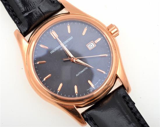 Automatic, circular black dial with applied gold baton numerals, date aperture at three, signed case, dial and movement, rose gold plated case and black leather bands, reference FC- 303X6B4-6, 42mm diameter.