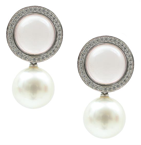 A PAIR OF SOUTH SEA PEARL, DIAMOND AND ROSE QUARTZ EARRINGS