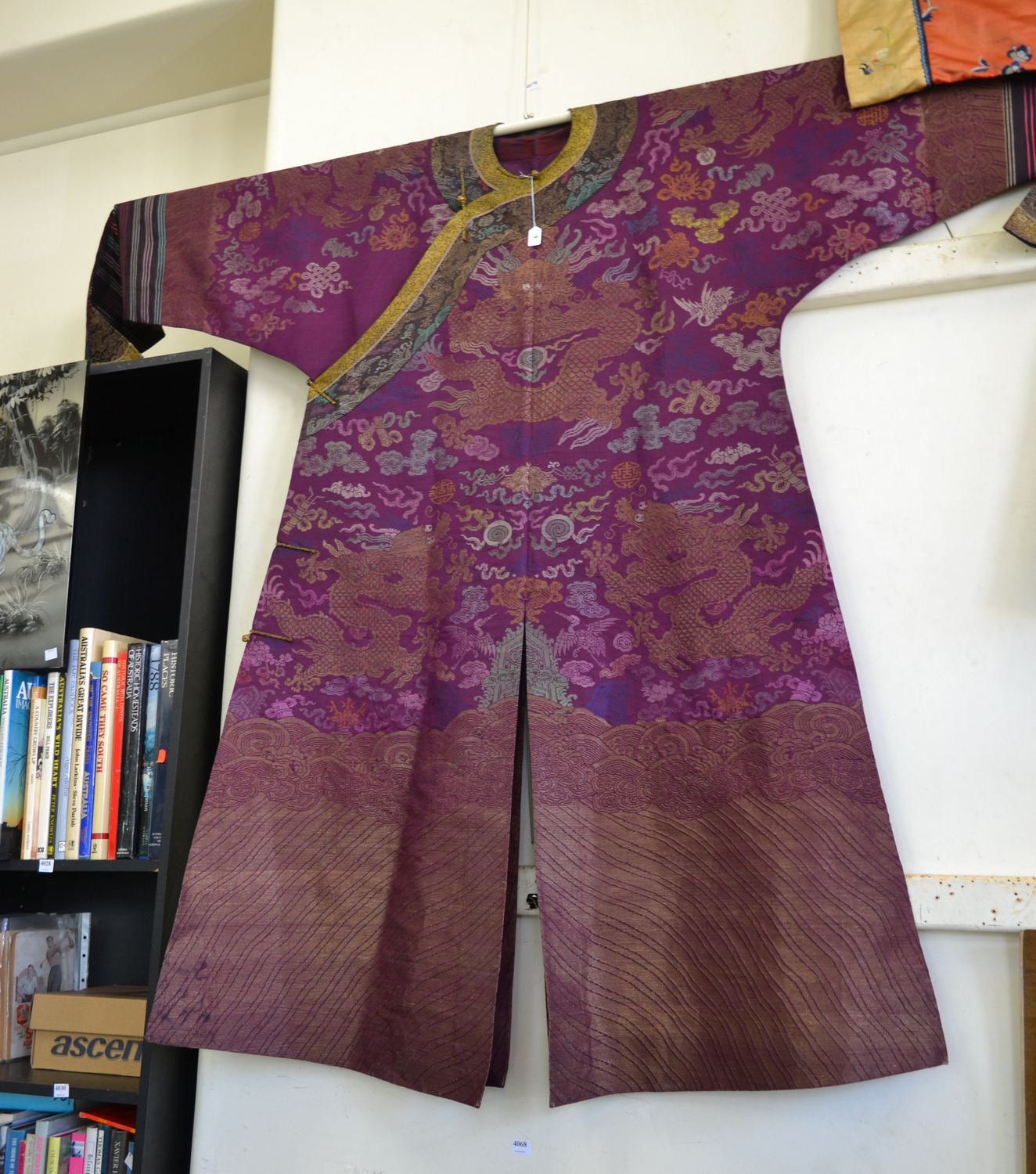Catalogue Note: this is a fine example of the richly patterned summer male dragon robes, characteristically worn by Mandarins of the provincial court. Robes such as these were produced in only two colours, burgundy and blue, burgundy such as this one, being the colour of the higher-ranking officials, blue the colour of the lower ranks. This robe is a very fine example of the workmanship produced by the new looms that were introduced during this period, the steam jacquard looms, horse-shoe cuff sleeves, typical of Qing court costume, original gilt buttons.
