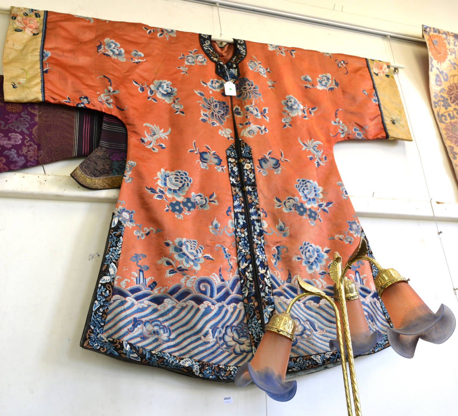 the embroidery in Peking knot and satin stitch, finely designed with seasonal flowers in white, sea-blue and sky-blue florals including peonies and chrysanthemum in stylised form to the body, the broad sleeve cuffs of pale gold silk, embroidered with a floral pattern in colourful design the lower section of the robe depicts a stormy sea with the imperial peonies scattered throughout, the border is black with gold threaded trim through a scrolling floral and foliate embroidered band with butterflies, the symbol of joy and happiness in marriage, three hollow repousse gilt buttons attached to the front of the robe, 114cm high