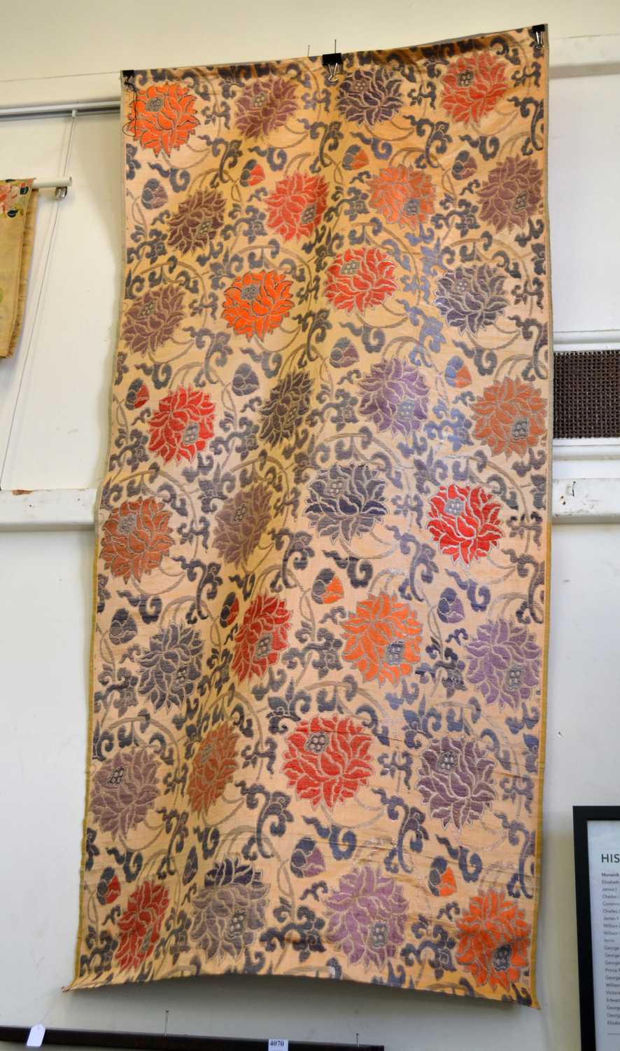 a bright gold silk ground decorated with large scrolling florals connected to stems forming tendrils and interspersed with stylised foliage. The colours range from deep saffron to burgundy, mauve and black, 74 x 149cm
