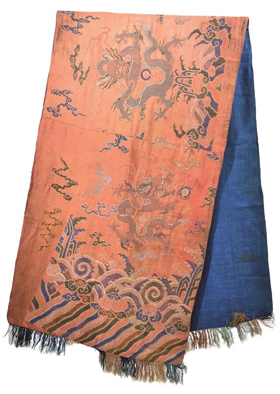 Made into a shawl, richly embroidered with mang four-claw dragons amidst clouds on a deep salmon ground, with the flaming pearl, the lishui borders at either end of the shawl with tassels, 218 x 68cm