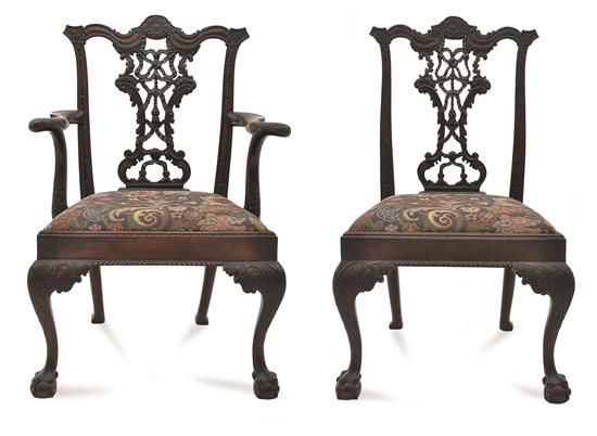 A SET OF SIX CHIPPENDALE STYLE MAHOGANY DINING CHAIRS