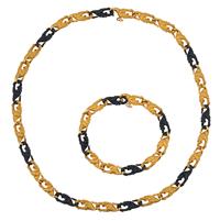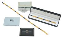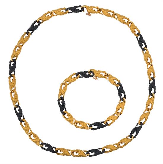 Featuring finely modelled interlinked panthers with interspersed anodized links, mounted in 18ct gold, total length 460mm and 190mm, boxed.