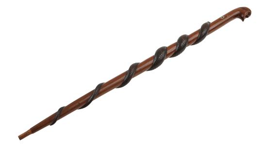 The tapered stem, brass tipped and carved in low relief with an encircling snake surmounted by a stylised head with incised delineation, (some loss to tip) 84.5cm long.