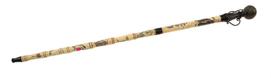 the tapered stem with rosewood tip and mid length bands displays multiple figurative incised and painted scenes to the bone sections, surmounted by a decorative brass incised spherical topped handle, 88.5 cm long.