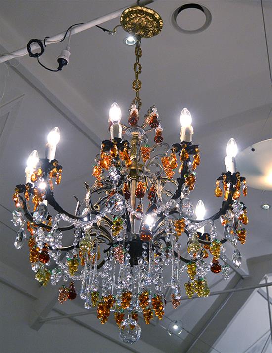 comprising alternating clear glass and coloured glass doplets, some coloured glass droplets in grape and pear form, 92cm width, total height 150cm