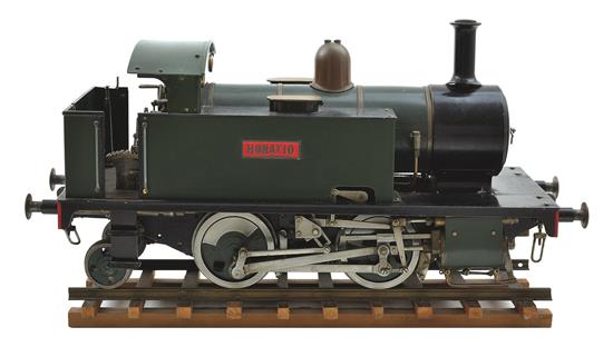 untested, with detailed cab and backhead fittings, vacuum hoses, handrails and steps, in green livery, with the name plate 'HORATIO' to both sides, displayed on a section of track, the locomotive 48cm long
