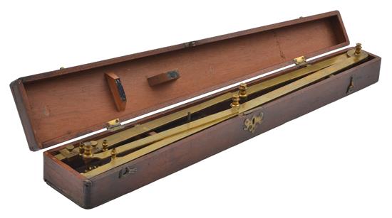 with engraved scales on two limbs, ivory rollers, housed in a mahogany case, engraved Made by Heath & Wing London, (lacking two ivory rollers and supports), 68cm long