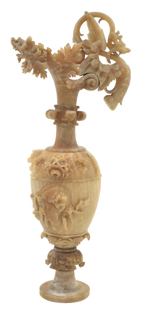 AN ORNATELY CARVED FIGURAL ALABASTER EWER