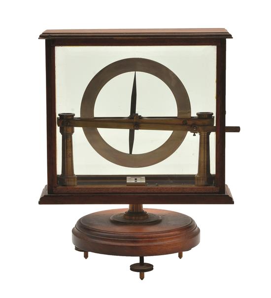 A BRASS DIP CIRCLE IN A GLAZED CASE