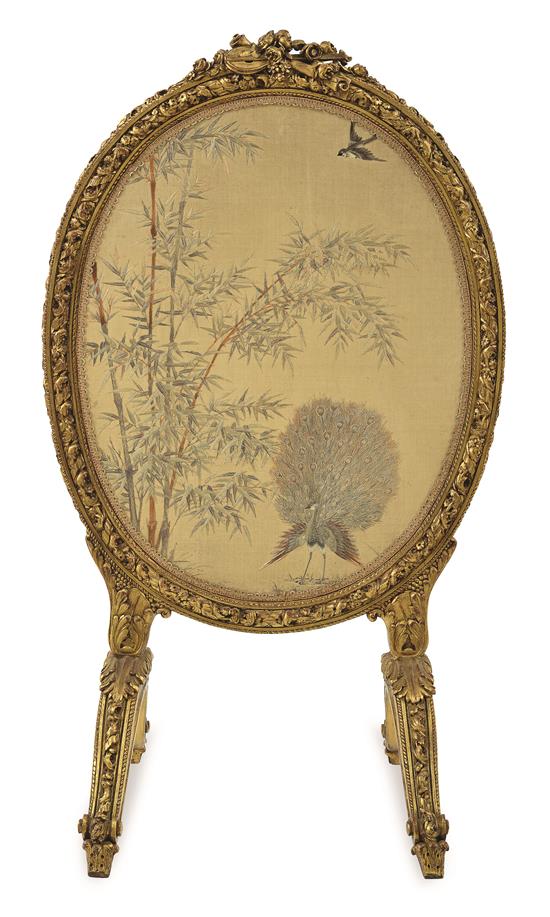 AN ELABORATE FRENCH SILK NEEDLEWORK FIRE SCREEN