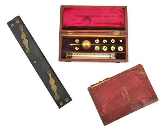 used to determine the concentrated strength of spirits, housed within a fitted case with an ivory maker's plaque, opening to a brass hydrometer float, eight weights, a ruler and a thermometer, the weights and float bearing a stamped serial number, accompanied by the publication Sikes' Tables of the Concentrated Strength of Spirits, the case 25cm long; together with a brass mounted ebony slide rule, 38cm long